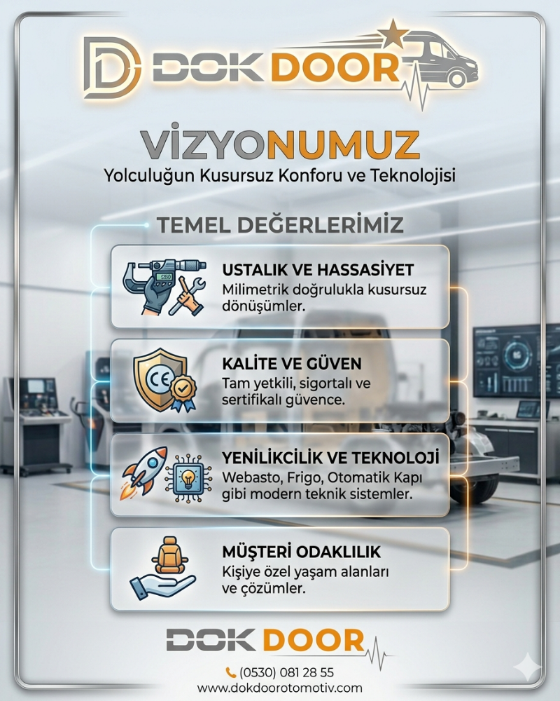 Dokdoor Otomotiv, sıradan araçları hayallerdeki yaşam alanlarına ve profesyonel iş ortaklarına dönüştüren, yenilikçi bir otomotiv çözüm merkezidir. Yola çıktığımız ilk andan itibaren temel ilkemiz; sadece araç tasarlamak değil, kullanıcılarımıza konfor, güven ve özgürlük sunan mobil çözümler üretmek olmuştur.Bölgemizde otomotiv dönüşüm ve teknik sistemler denilince akla gelen ilk isimlerden biri olmanın gururunu yaşıyoruz. Tecrübeli ekibimizle, her aracı bir mühendislik ve tasarım harikası olarak ele alıyor, standartların ötesine geçiyoruz.
